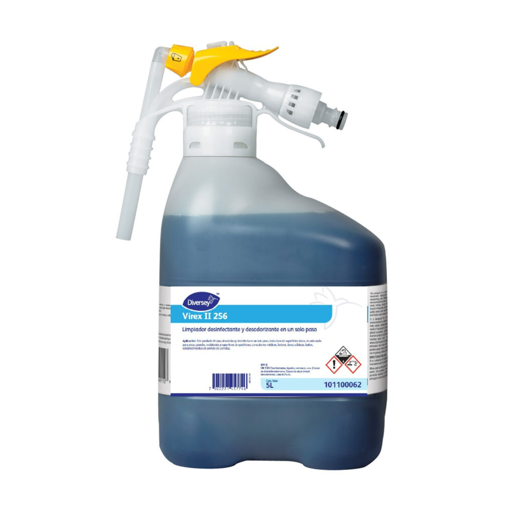 Desinfectante para superficies VIREX II 256 5L limpia, desodoriza y desinfecta en un solo paso, toda clase de superficies duras. Este producto es adecuado para pisos, paredes, mobiliarios y superficies de quirófanos. Mata microorganismos en un amplio espectro incluyendo HIV-1, VRE, MRSA, GRSA, MRSE, VISA, PRSP, Herpes Simple Tipos 1 y 2, Influenza Tipo A2, Adenovirus, Rotavirus y muchos más.
