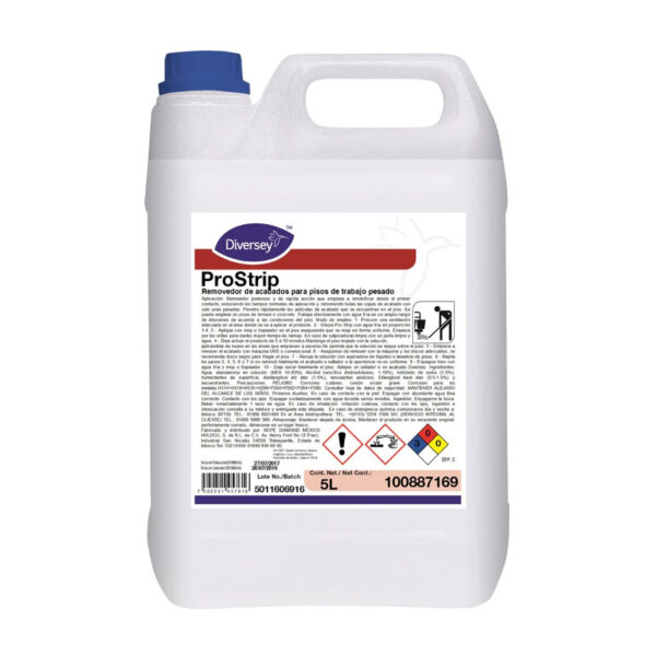 Removedor Pro Strip Diversey 1 Gl de acabados para pisos. Para trabajo pesado. Penetra rápidamente las películas de acabado del piso, reduce retrabajos, trabaja efectivamente con agua fría en un amplio rango de diluciones según las condiciones del piso. Este limpiador de baja espuma actúa rápidamente, penetrando las capas de acabado para eliminarlas de manera efectiva. Sin butil glicol, amoníaco ni productos cáusticos, tiene bajo olor, ideal para entornos sensibles. No requiere protección de ojos ni manos con la dilución recomendada. Es perfecto para educación, salud, contratistas de servicios, tiendas y hospedaje.