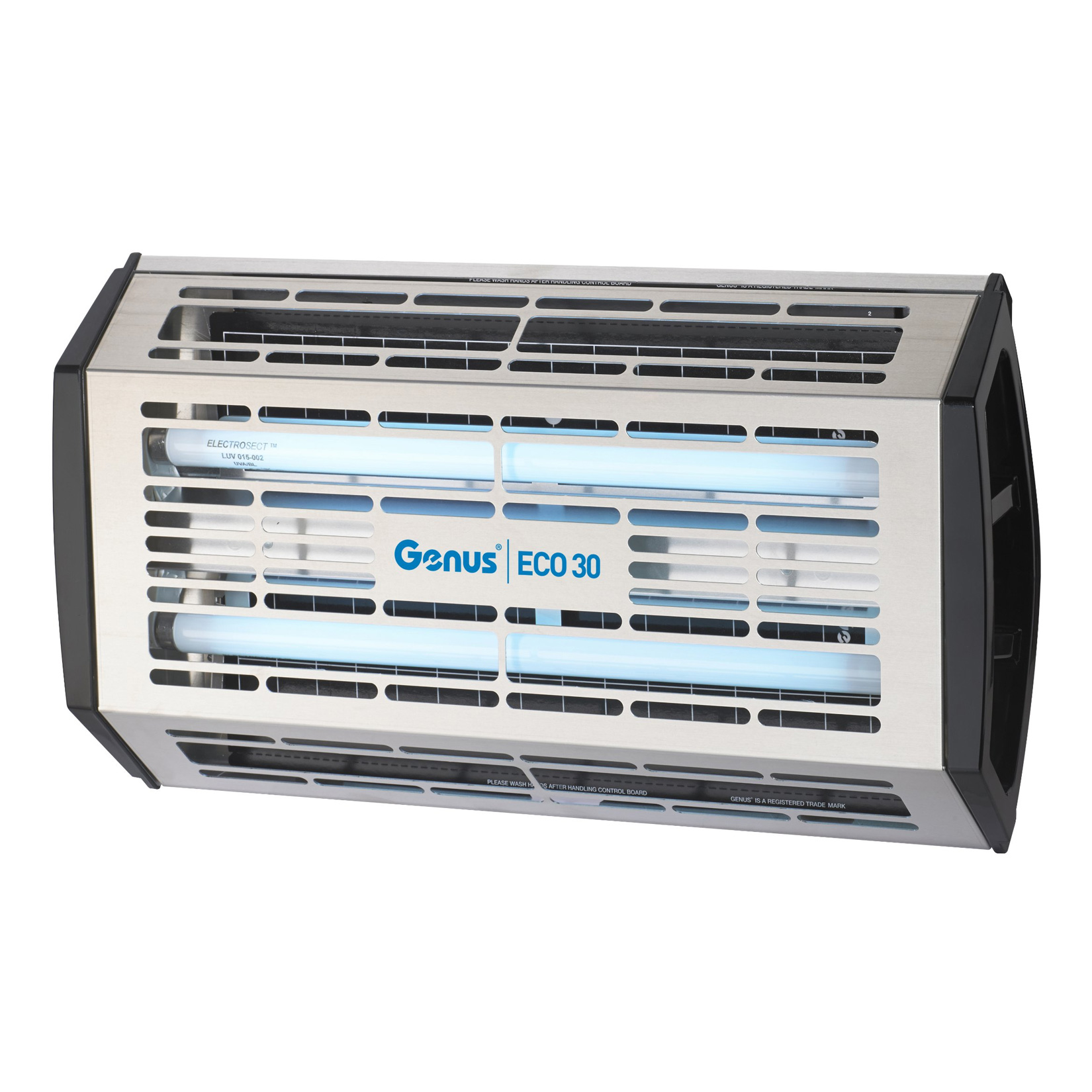 Lámpara trapa moscas Genus Eco 30 2 tubos-15 W ofrece una captura rápida de moscas con costos de funcionamiento eficientes para su uso en diversas áreas de aplicación. La unidad se puede colocar en una variedad de ubicaciones debido a su flexibilidad de poder montarla en la pared horizontal o verticalmente. utiliza el tablero adhesivo universal de Brandeburgo, totalmente marcado en cuadrícula y compatible con HACCP, que proporciona una gran área de captura de moscas. La unidad utiliza dos lámparas UVA de 15 vatios junto con reflectores de lámpara integrales para maximizar la salida de rayos UVA y mejorar la eficacia en la captura de moscas. El mantenimiento es rápido y fácil gracias a su cubierta con bisagras que se levanta y mantiene, lo que permite cambiar la placa adhesiva y las lámparas con ambas manos libres.