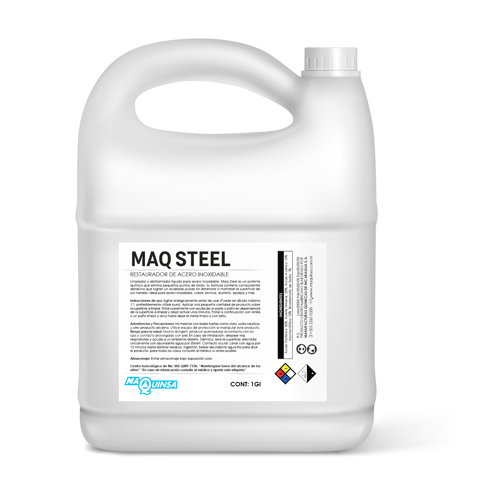 Restaurador de metales Maq Steel para acero inoxidable. Su fórmula avanzada elimina manchas, huellas dactilares y oxidación, dejando un acabado brillante y duradero. Ideal para su uso en cocinas, electrodomésticos, muebles y cualquier superficie de acero inoxidable.